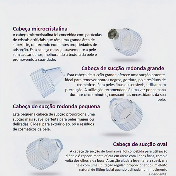 O dispositivo vem com 4 acessórios intercambiáveis, cada um projetado para atender a preocupações específicas da pele. Veja o gráfico abaixo para mais detalhes sobre como cada acessório funciona!